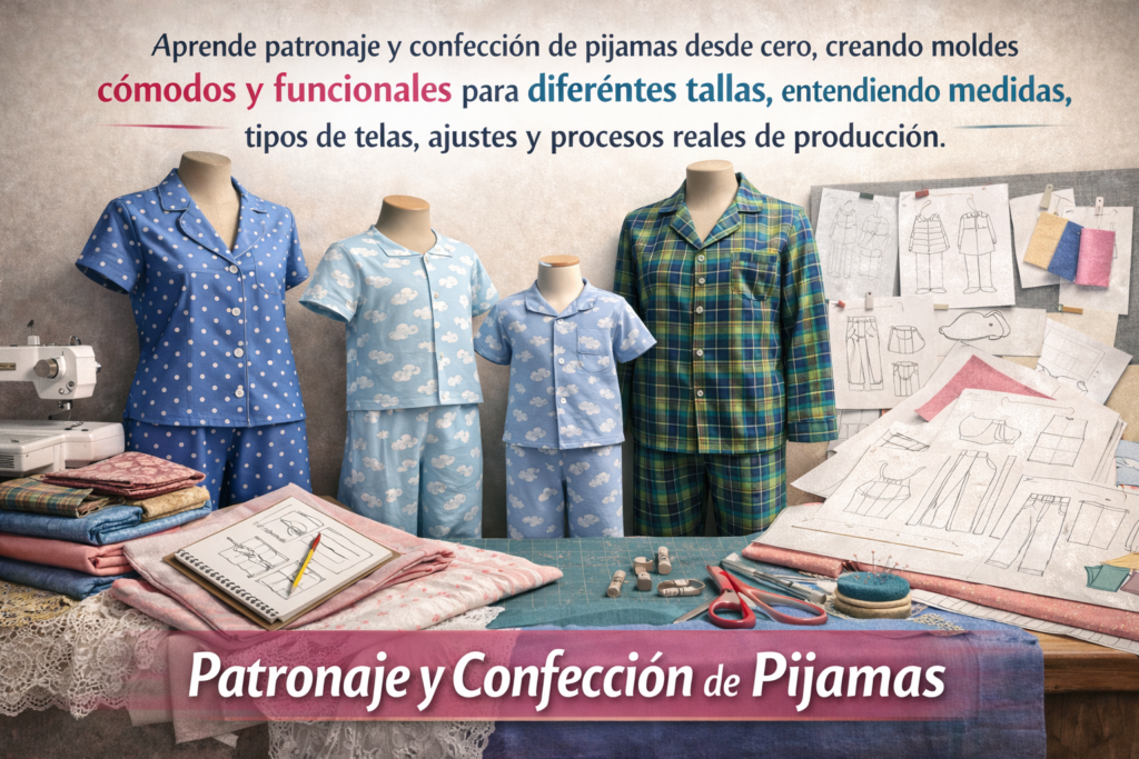 Aprende patronaje y confección de pijamas desde cero, creando moldes cómodos y funcionales para diferentes tallas, entendiendo medidas, tipos de telas, ajustes y procesos reales de producción.